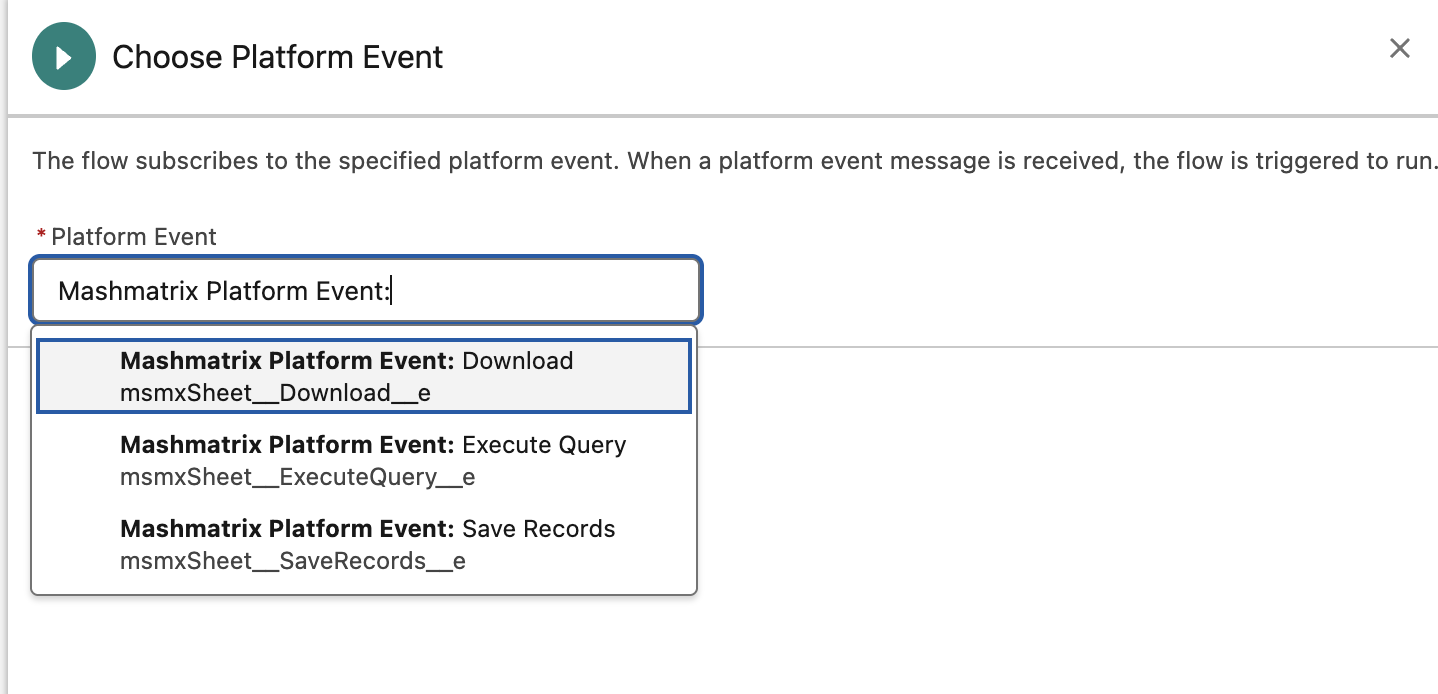 To capture Mashmatrix Sheet operation events, create a new platform event-triggered flow using Flow Builder.