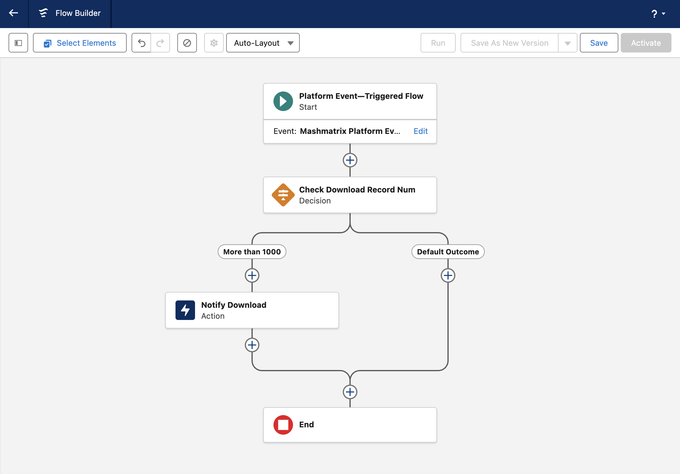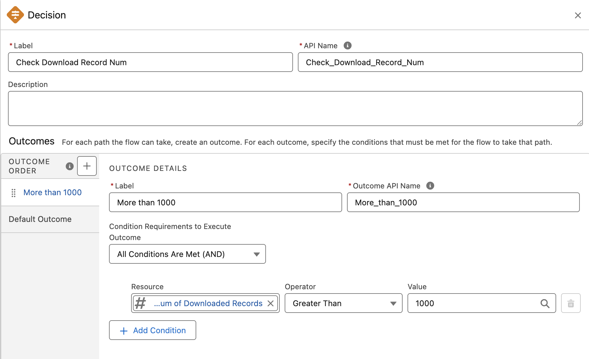 Use platform event field values as conditions to branch flow execution or configure additional actions and notification processing. The example in the image below sends an email to administrators when the number of target records for download operations exceeds 1,000.