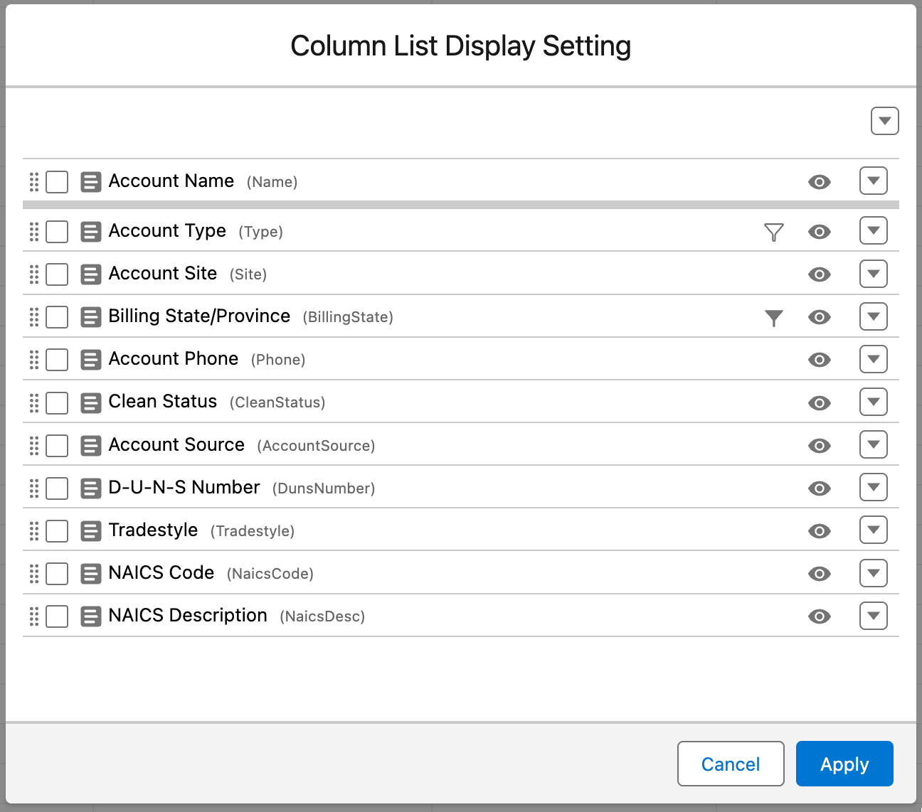 1. Click on the header menu at the far right of the column headers and select "Column List Display Setting".