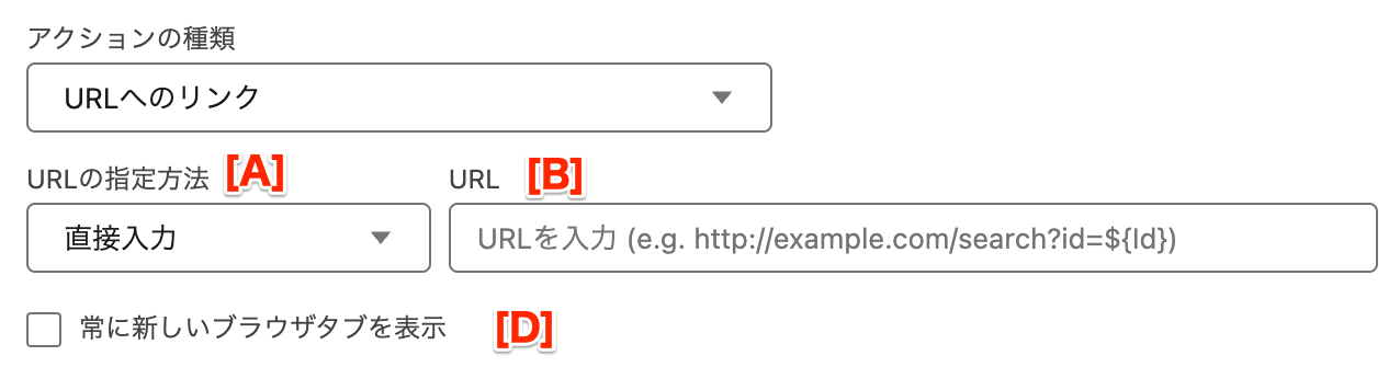 * **\[B] URL** - 「URLの指定方法」として「直接入力」が選ばれている場合に入力可能となります。URLに指定する文字列には`${Id}`のように`${`と`}`で項目のAPI参照名を囲うことでレコードの値を埋め込んで利用することも可能です