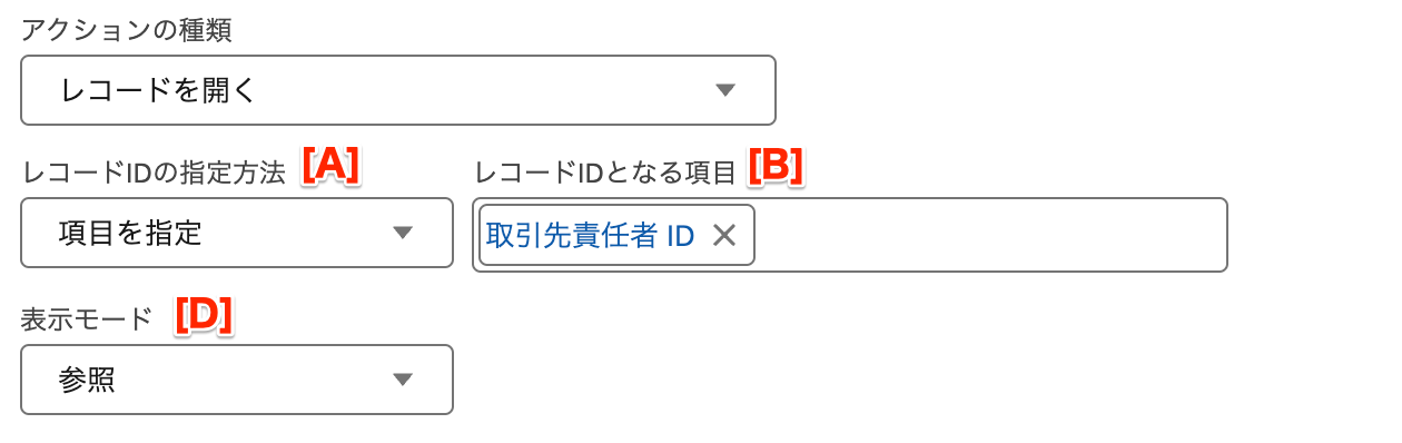* **\[A] レコードIDの指定方法** - 開く対象となるレコードのレコードIDをどのように指定するかを選択します