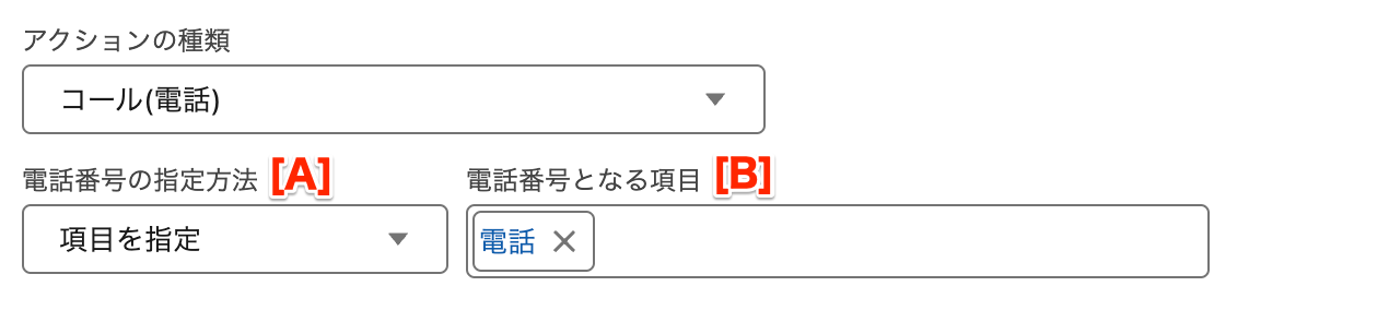 * **\[B] 電話番号となる項目** - 「電話番号の指定方法」として「項目を指定」が選ばれている場合に入力可能となります。シートの主オブジェクトの項目から電話番号となる項目を選択します。