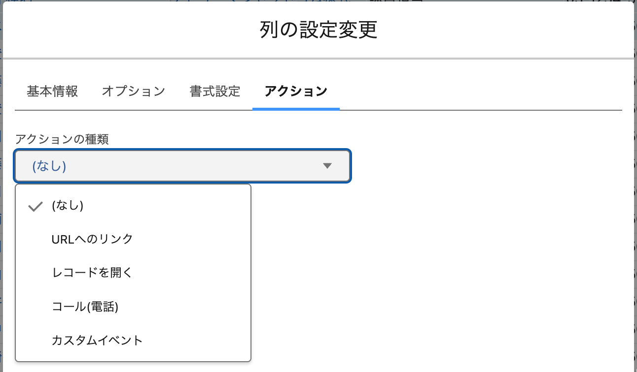 アクションタブでは、列の中のセルにリンク（アクションリンク）を設定して、リンクのクリック時に特定のアクションが行われるように指定できます。