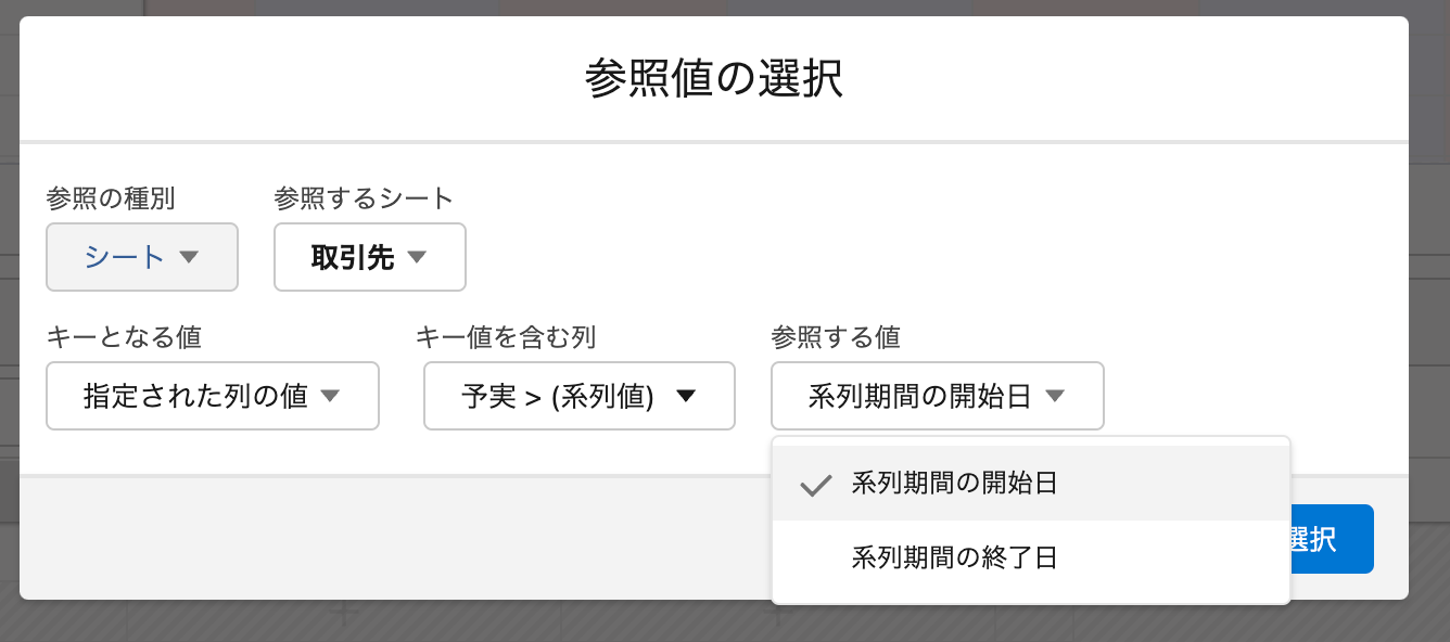 * **系列期間の開始日** - 選択されている系列を期間で表した場合の先頭の日付を参照します。例えばマトリックス列の表示間隔が「月ごと」で、「2023/4」の系列にカーソルが当たっている場合、この値は「2023-04-01」となります。