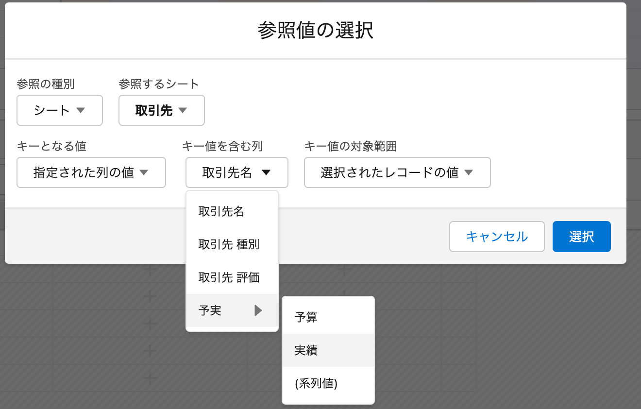 マトリックス列の内部列を参照するには、参照値の選択ダイアログでマトリックス列を含むシートを参照の対象とし、キー値を含む列にマトリックス列を選び、サブメニューから参照したい内部列を選びます。
